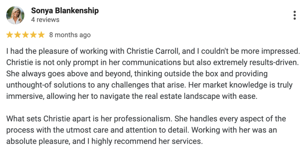 “As someone who has personally bought and sold over 200 homes, I’ve worked with a lot of realtors, but Christie is truly in a league of her own. If you’re looking for a realtor in Rome, GA, she’s the one you want. From the very beginning, she was always two steps ahead. I never had to follow up or ask her for anything, she was already on it. Her communication, professionalism, and attention to detail are unmatched. She’s so good, she’s now the only person I trust to sell my houses. Hands down, the best Realtor I’ve ever worked with.”